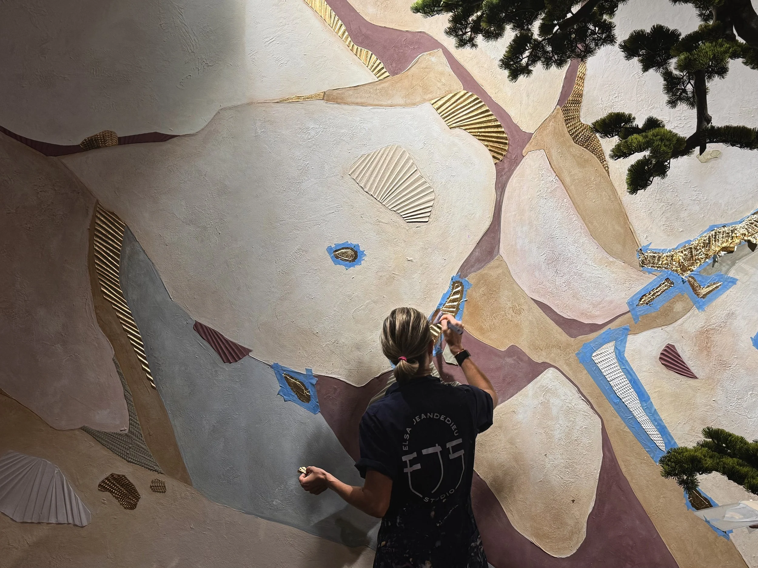 Hand-applying her signature gold leaf across the undulating mineral peaks of the mural, creation was experienced as a meditative performance. As gold caught the light, the landscape emerged gradually, mirroring the way a morning mist might lift over a mountain range.