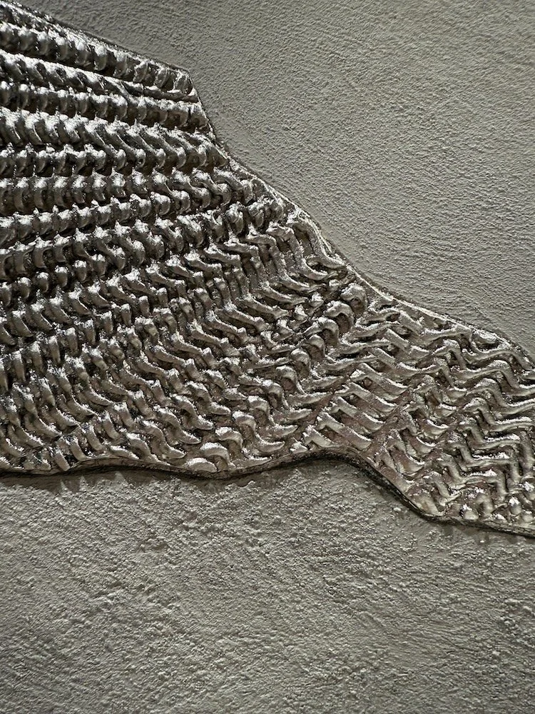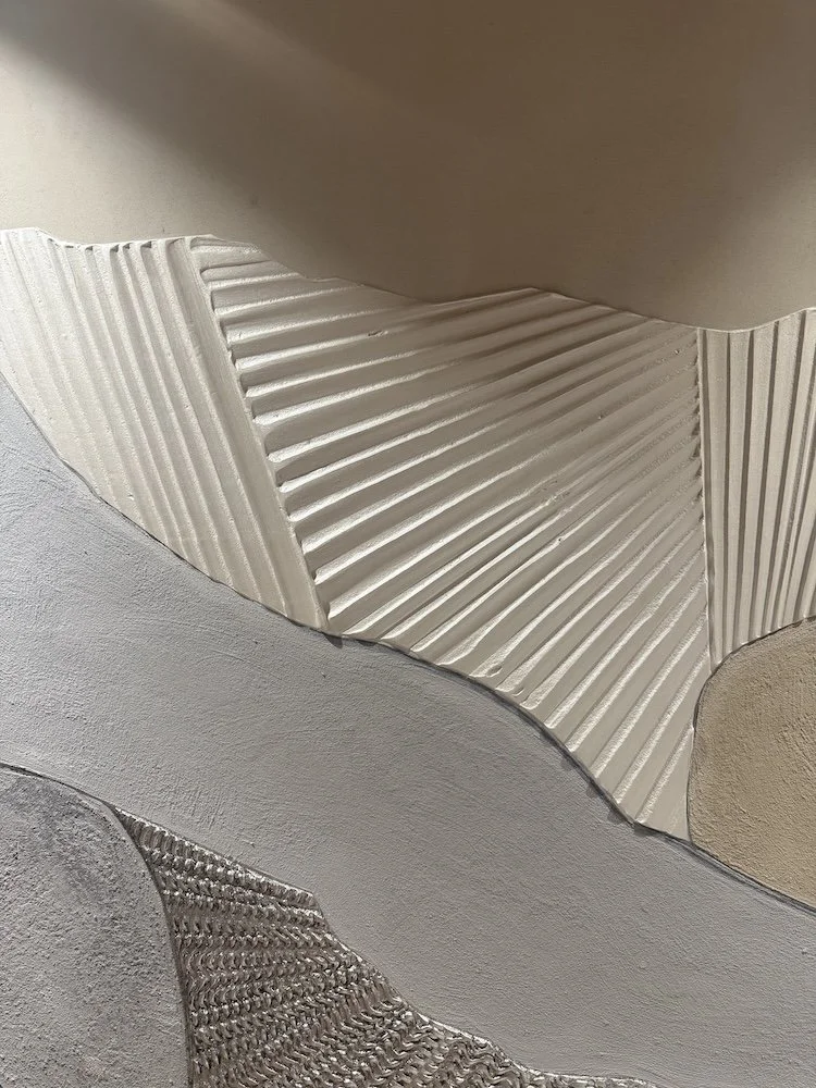 Merging Elsa Jeandedieu’s signature “Oscillation” and “Tweed” textures, the mural features a harmonious palette of warm beige tones, accented by shimmering silver leaves.