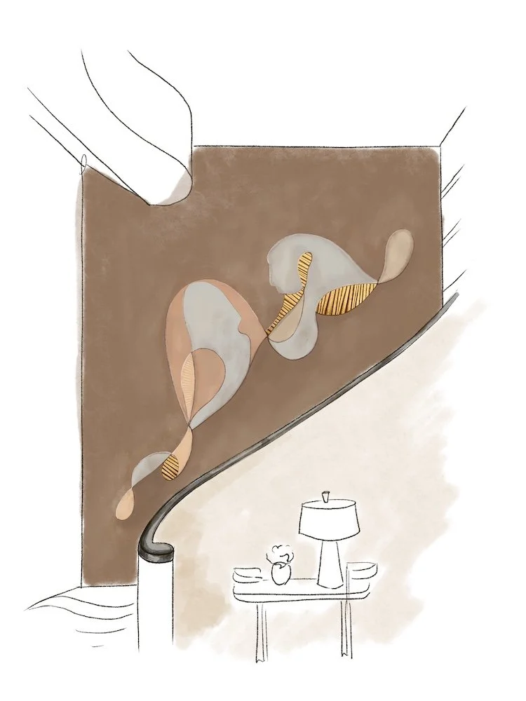 Elsa Jeandedieu crafted this textured mural along the curved wall beside the elegant spiral staircase in the living room of a private residence, using mineral plaster and accents of imitation gold leaves to create an artwork that gracefully extends across the upper surface of the staircase and below.